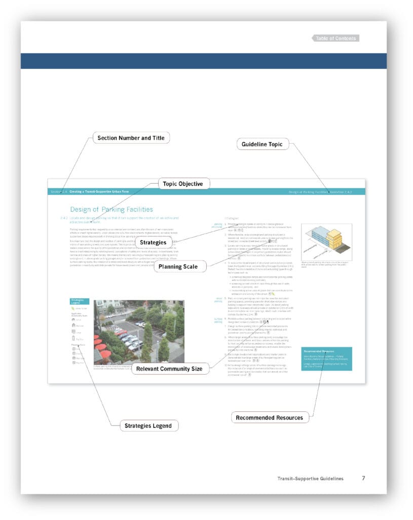 These new guidelines are a distillation of transit-friendly land use planning, urban design and operational practices, drawing from examples in Ontario, elsewhere in North America and abroad. Their aim is to assist urban planners, transit planners, developers and others, working in communities of all sizes, in creating an environment that is supportive of transit and increasing transit ridership. The guidelines are organized into a series of topics, each of which contains strategies applicable to all community scales. The document also features best practice case studies, a glossary of terms, an index and a summary of resources and references.