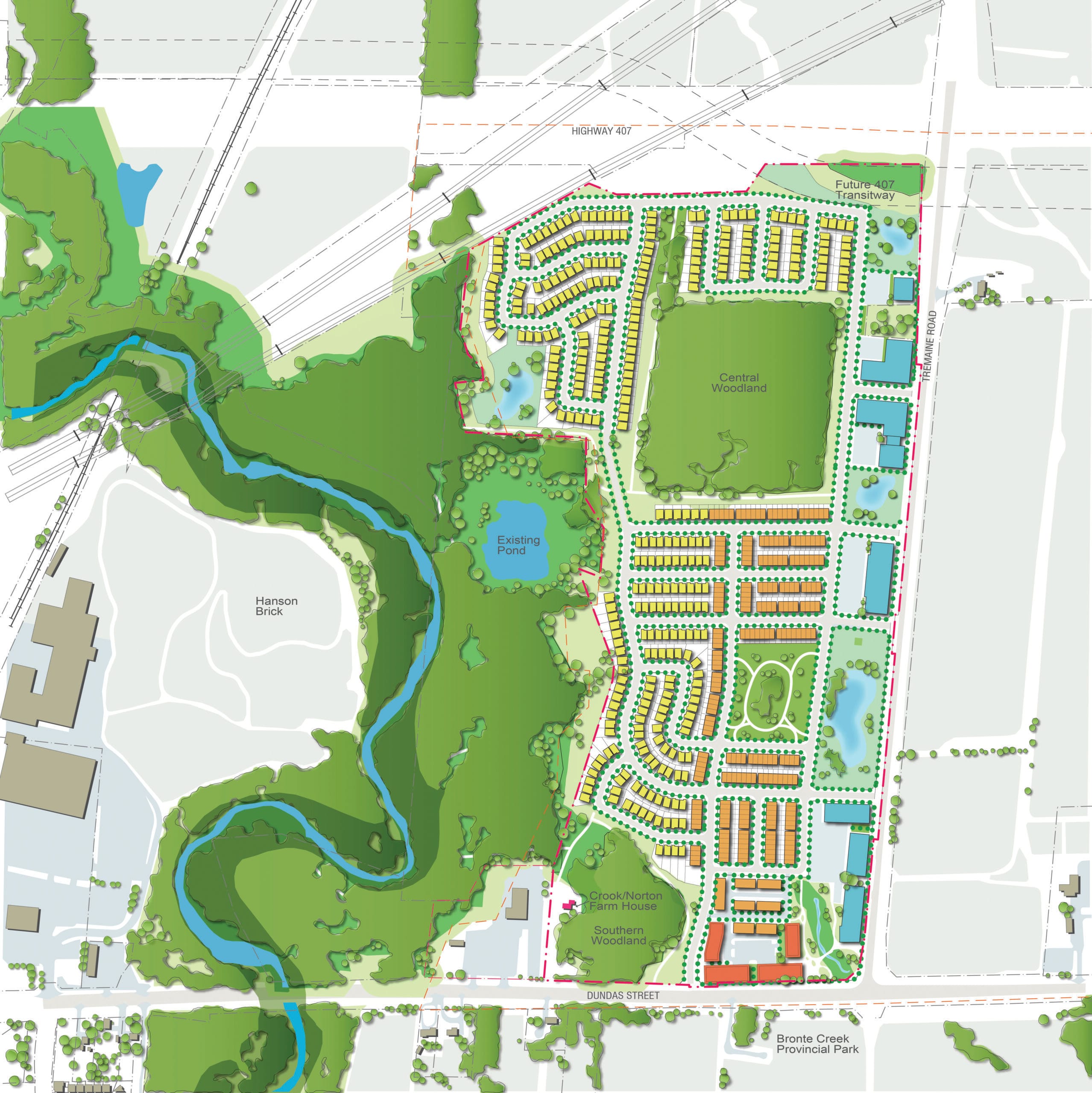 The concept plan is premised on the integration of innovative sustainable community design strategies, including opportunities for low-impact stormwater management, superior energy efficiency standards, enhanced landscaping, renewable energy, and other sustainable building techniques. A diverse mix of land uses will help to create a complete community, providing over 750 new homes and over 850 jobs that will be complemented with new parks and open spaces all within walking distance of each other. A range of housing options, including single-family homes, townhouses and apartment units, will create housing options for people at all stages of their lifecycle. A 2-hectare public park is planned at the centre of the community, providing opportunities for passive and active recreation, while other open space areas and trails will support access throughout the area. The plan also achieves the preservation and adaptive re-use of a heritage house along Dundas Street.