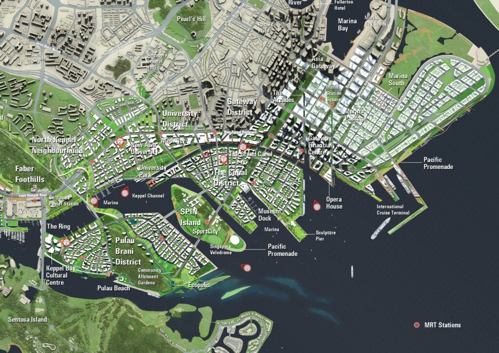Singapore’s Urban Redevelopment Authority invited international design firms to harness fresh and innovative master planning concepts for the long term transformation of Singapore’s Greater Southern Waterfront into one of the great urban waterfronts of the world. Urban Strategies led a multi –disciplinary team including Behnisch Architects as well as civil, transportation and sustainability engineers from Buro Happold to devise a sustainable framework of new mixed-use districts and open spaces with a special emphasis on diversity, flexibility and quality of life. Our design proposes a series of unique districts, including world-class spaces where innovation and commerce can thrive, as well as locally significant, diverse and human scaled places which people will call home. Together these places will embody the fusion of LIVING CITY/GLOBAL CITY.