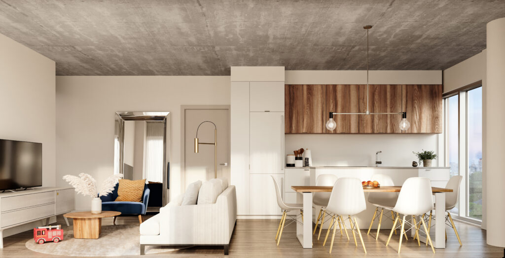 The project includes many features to support livability for residents, including thoughtful indoor and outdoor amenity spaces that encourage interaction (including stroller parking on each floor, music practice rooms and a fitness centre with visual connection to a children’s play room), and amenity for the local community via a mid-block walkway connecting the surrounding neighbourhood to the local school next door. Layouts support multi-generational living with larger suites suitable for families with children and innovative in-law suites with self contained living spaces that can be connected to the main unit. At grade retail spaces maintain the thriving main-street retail of The Queensway.